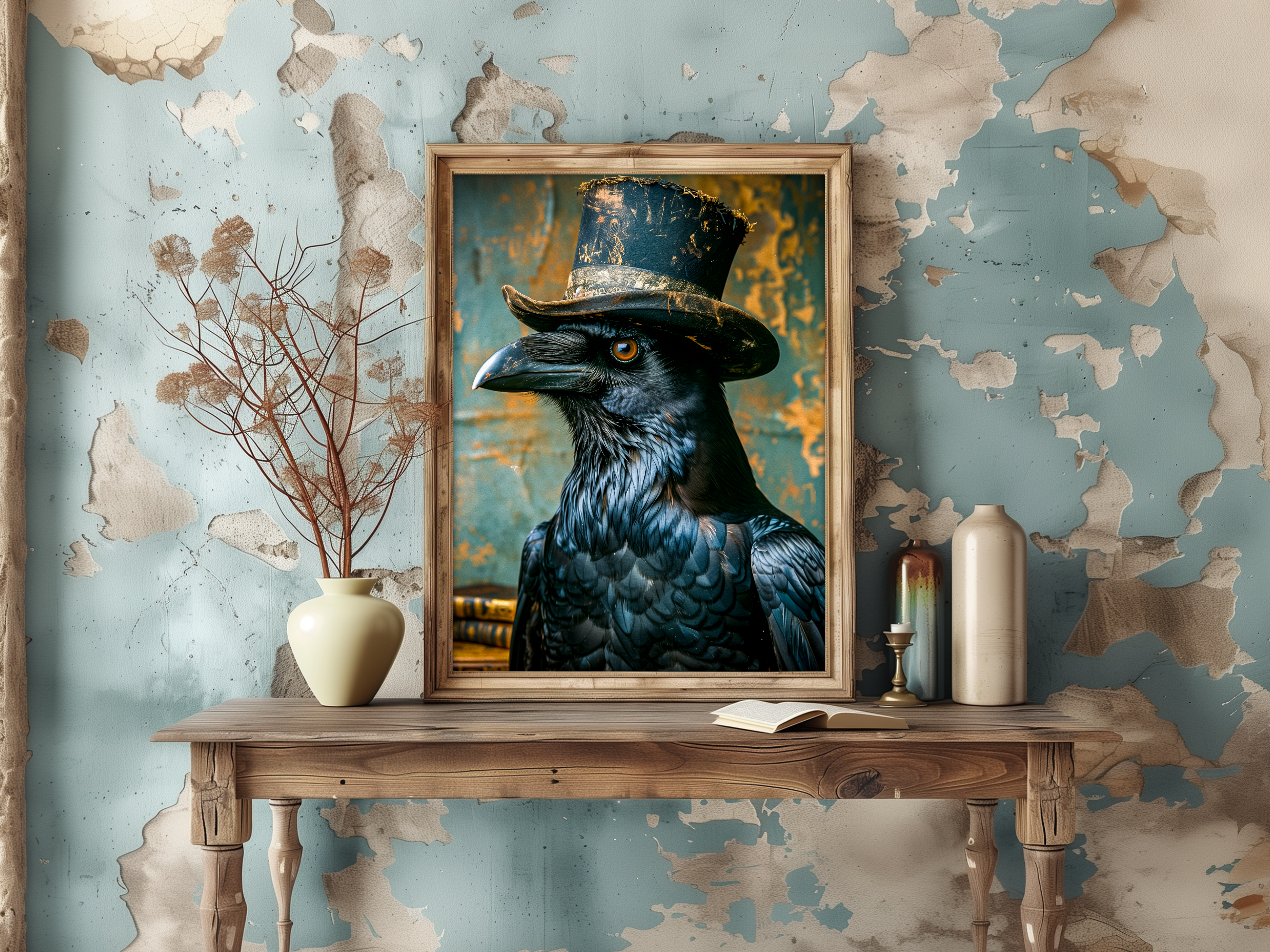 This enchanting "Victorian Crow Painting" portrays a majestic night bird adorned with a black top hat, embodying the whimsical elegance of royalcore and regency aesthetics. Perfect for a dark forest gallery wall, this vintage portrait of the crow evokes a sense of mystery and sophistication, inviting viewers into a world of enchantment and intrigue.