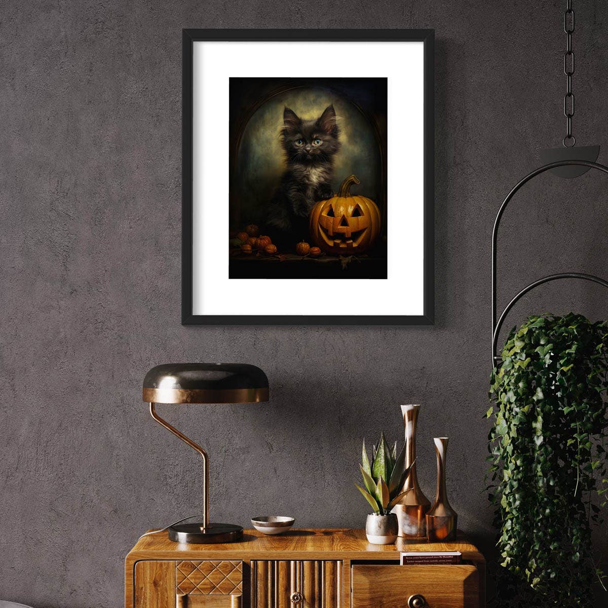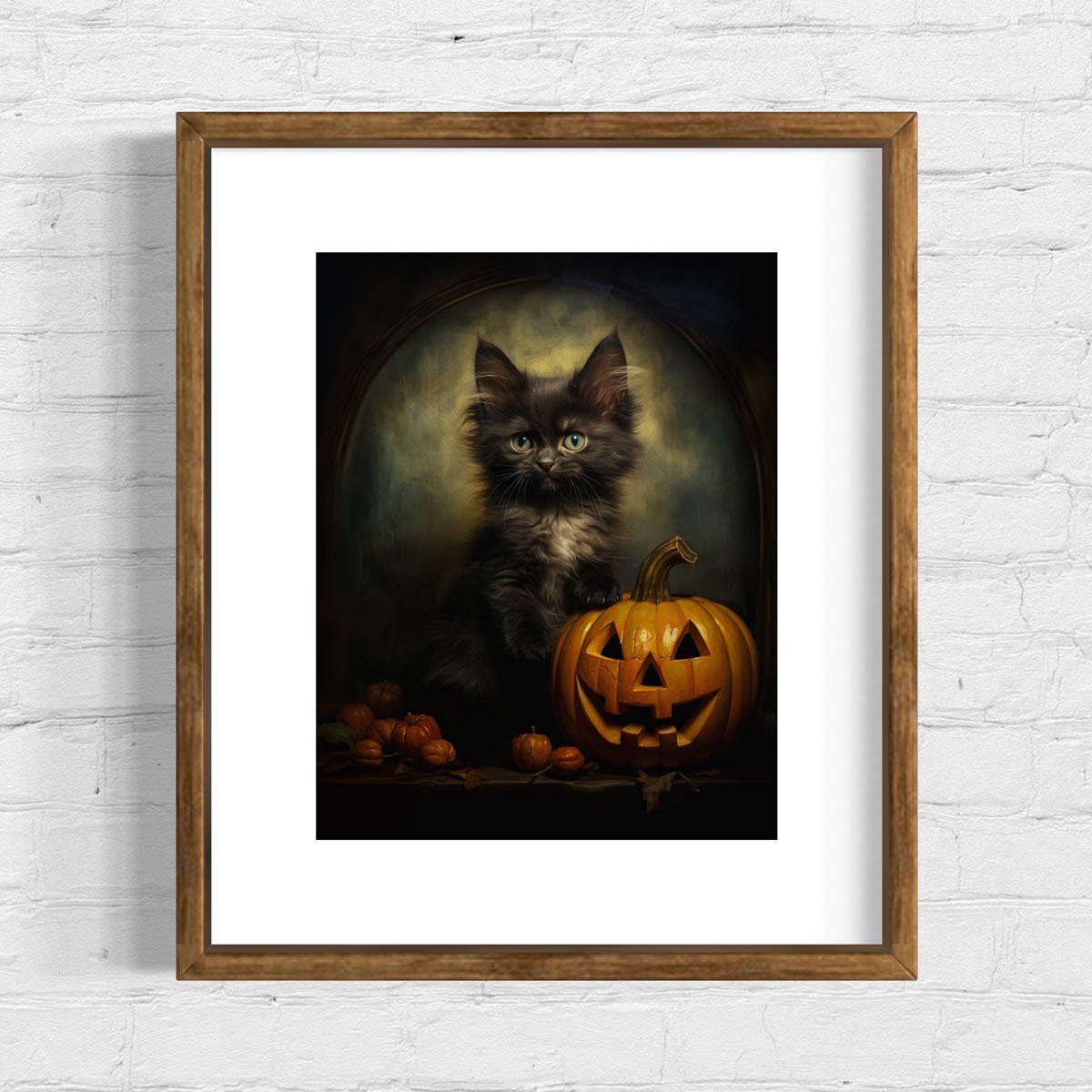 Evoke the spirit of Halloween and witchy charm with black cat and jack-o'-lantern pumpkin wall art. This captivating piece features a Halloween kitten, perfect for adding a touch of spookiness to your kitchen decor. With its moody aesthetic and antique oil painting style, it captures the essence of a bewitching and mysterious atmosphere.