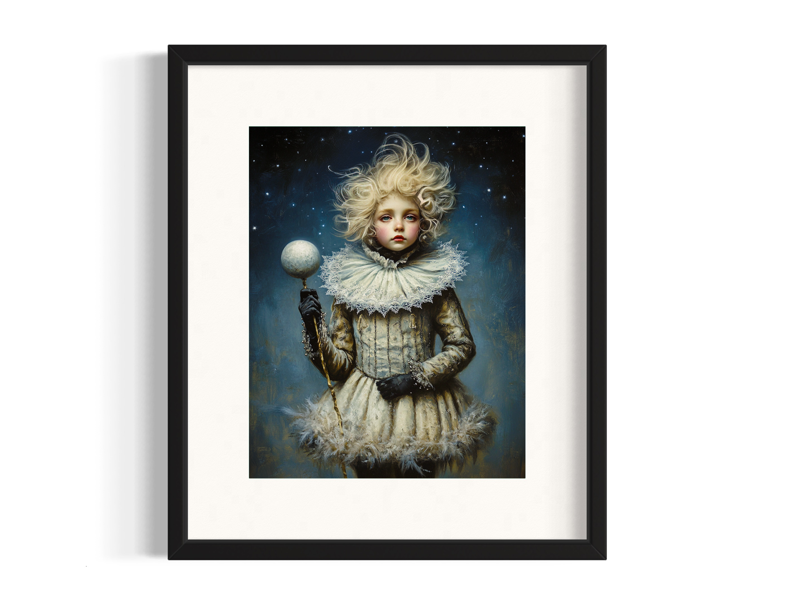 This enchanting art print portrays a whimsical take on Jack Frost, depicted as an ethereal figure with delicate, almost otherworldly features. Dressed in vintage-inspired attire adorned with lace and feathery details, Jack holds a frosty orb, casting a cool glow against a deep blue, star-filled backdrop. With windswept hair and a serene, mysterious gaze, this artwork captures the essence of winter’s magic, making it an ideal piece for those who appreciate the wonder and whimsy of the season. Perfect for bringing a touch of fairytale charm to any space, this art print invites the quiet beauty of winter indoors.